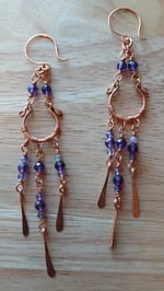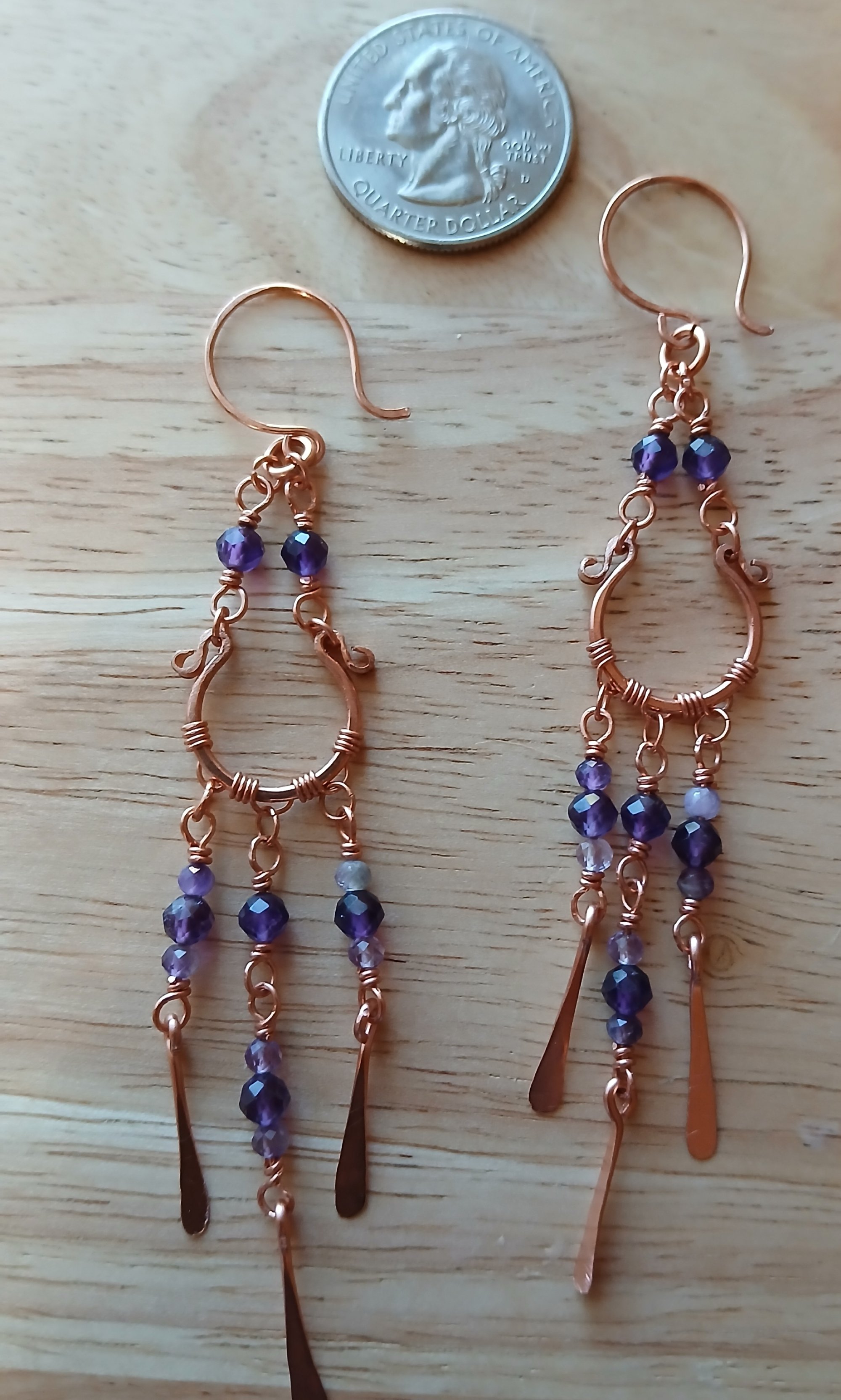 These earrings are completely handcrafted copper chandelier earrings with assorted tones of amethyst beads. The frame and ear wires are hammered and put through the tumbler for strength. The beads are wrapped with a hammered paddles attached to the ends.