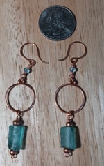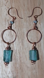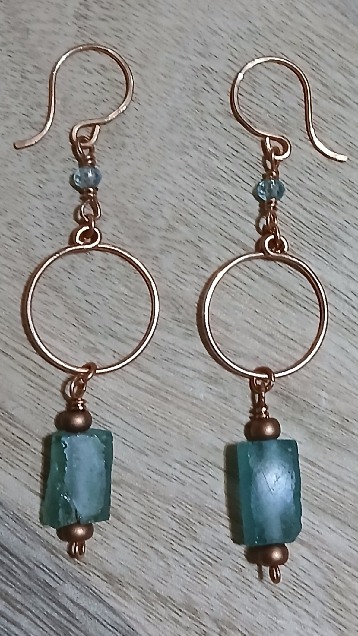 Love em, love em, love em!!!!! The earrings are completely hand made. The hoops and ear wires are hammered for strength. The Aqua Roman bead has a glass copper bead on each end, to add that perfect effect on bringing out that blue hue. Connecting the hoop to the ear wire is a wire wrapped aquamarine stone.
