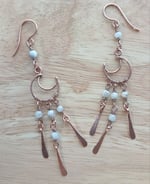Handcrafted crescent moon and aquamarine patinaed earrings. The moon shape and ear wires were hand formed and hammered for strength. The aquamarine beads are intricately wire wrapped with hammered copper droplets added. I patinaed the design to give an antique look. They were tumbled for strength and a beautiful shine.