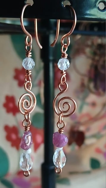 Handcrafted earrings: the spiral and ear hooks are hammered for strength. these earrings are white cubic zirconia, pink tourmaline, and a teardrop crystal.