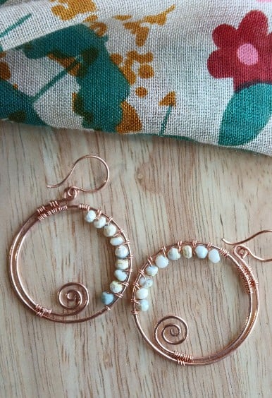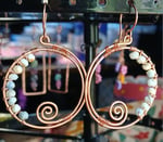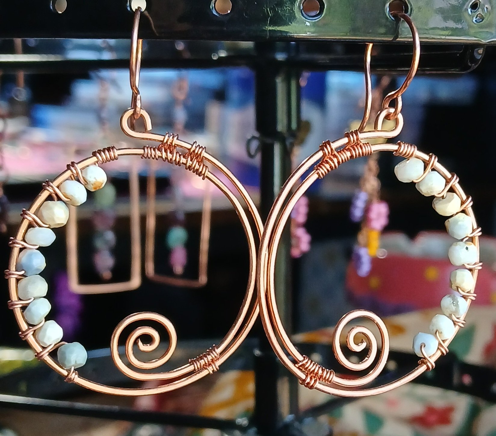 The completely handcrafted hoops and ear wires are hammered for strength. The Peruvian Opals are wire wrapped to the hoops. Thinner wire secures the beads and creates a decorative look and also securing the hoop from losing its form.