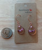These earrings are completely handcrafted. The teardrop formed copper frames and ear wires are hammered for strength. Strung and wrapped pink sapphire rondelle beads and a single pink fire polished glass bead.