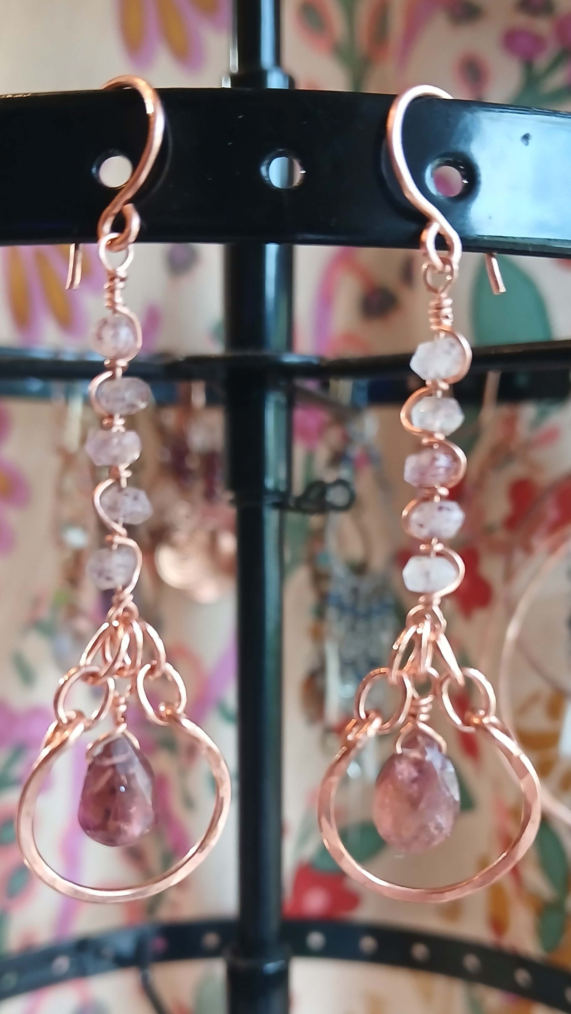 The frame of these handcrafted earrings are hammered to give strength, to maintain shape and to add a bit of shimmer 💖 The beaded stem is created by connecting individual strawberry quartz with hand turned loops. The beautiful pink tourmaline briolette is connected with a top drill wire wrap and jump rings creating the image of a messy chic coil.