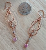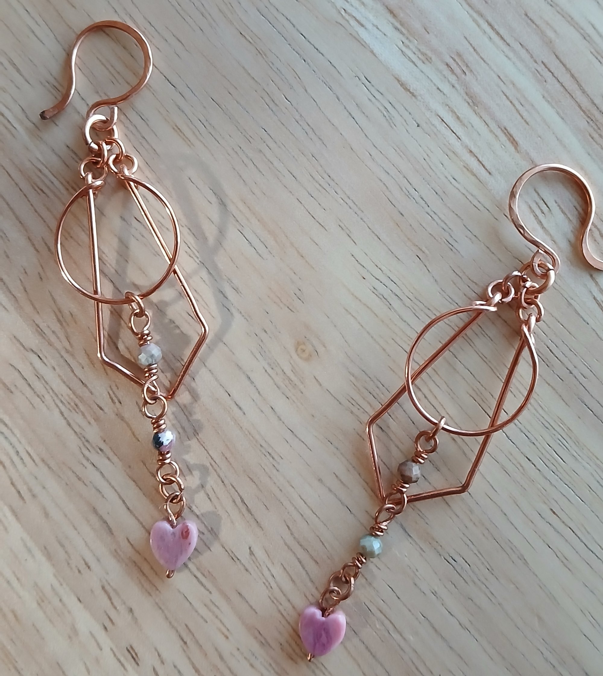 These completely handcrafted earrings are designed using a nested shape technique, creating a visual depth without too much weight. Dangling are tiny faceted Rhodonite gemstones leading down to an adorable rhodonite heart. All components are hammered for strength. The French Hook ear wires are hammered for a nice high-end detail.